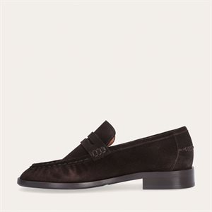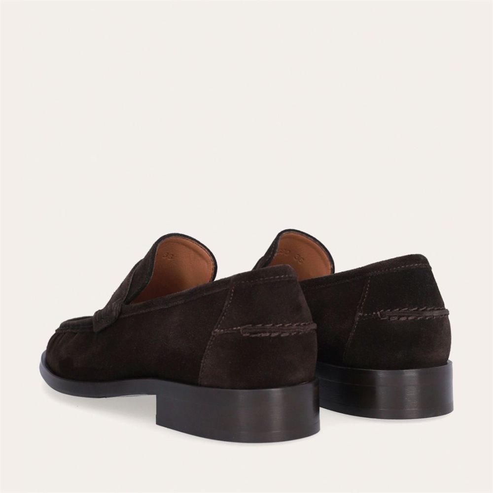 Håndlavet loafer, udført i mørkebrunt ruskind med rund tå. Foran er loaferen dekoreret med en markeret stikning, hvor skindet danner en let rynkning, der understreger den håndværksmæssige finish og en strop med et dekorativt cut-out henover forfoden.
