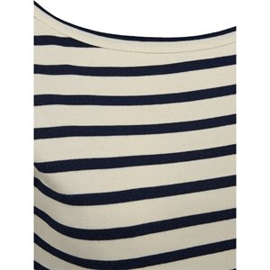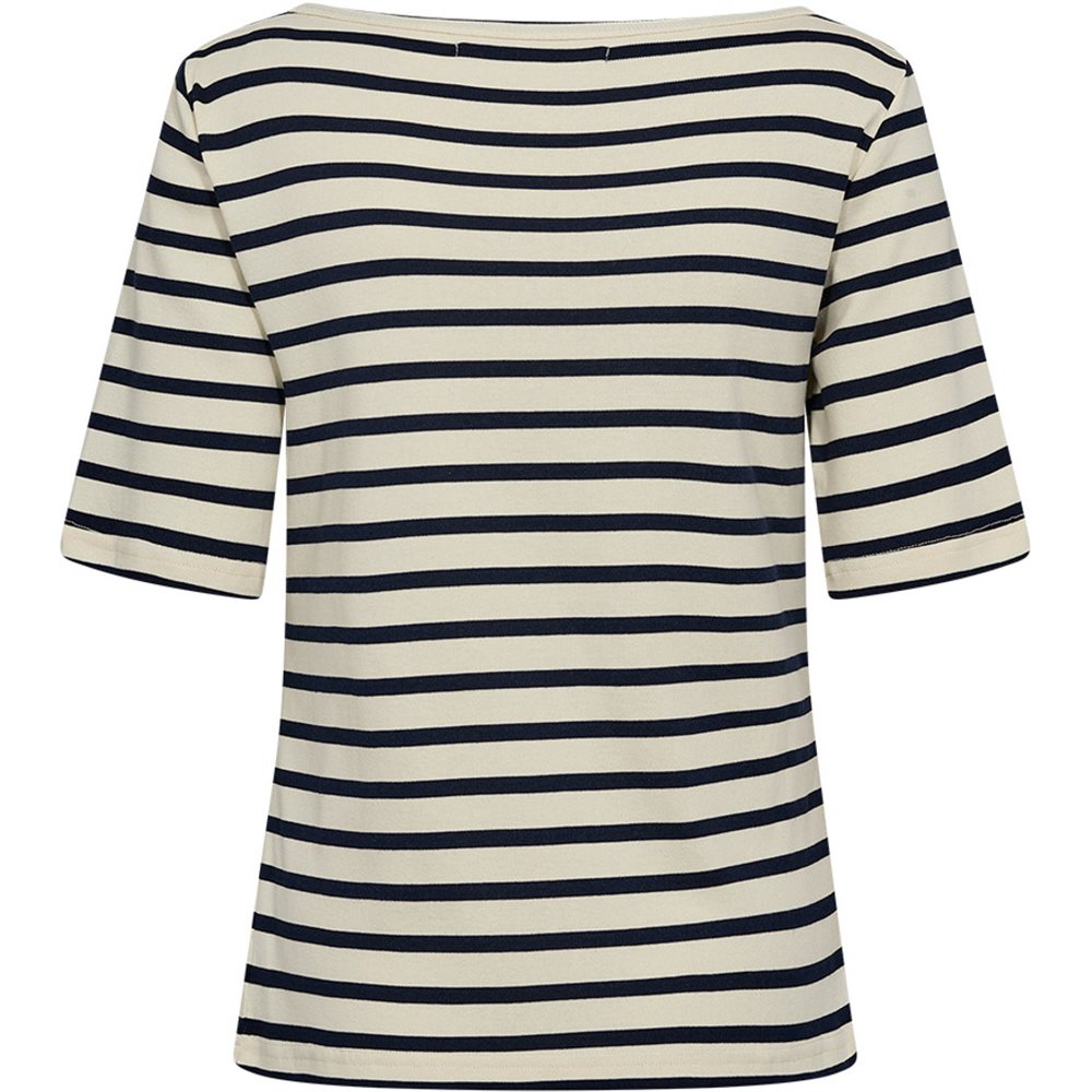 Kortærmet tidsløs stribet T-shirt med bådudskæring og let løs pasform.
