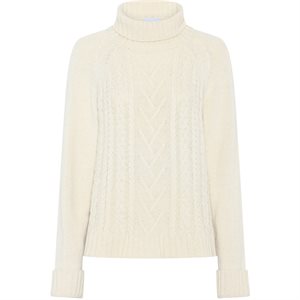 Cana Cable Knit er en skøn off-white strik med klassisk kabelstrik på forstykket. Den har en boxy pasform, der gør den nem at style over en skjorte eller alene, en blød rullekrave og opfoldede ærmer, som giver et afslappet og moderne udtryk.