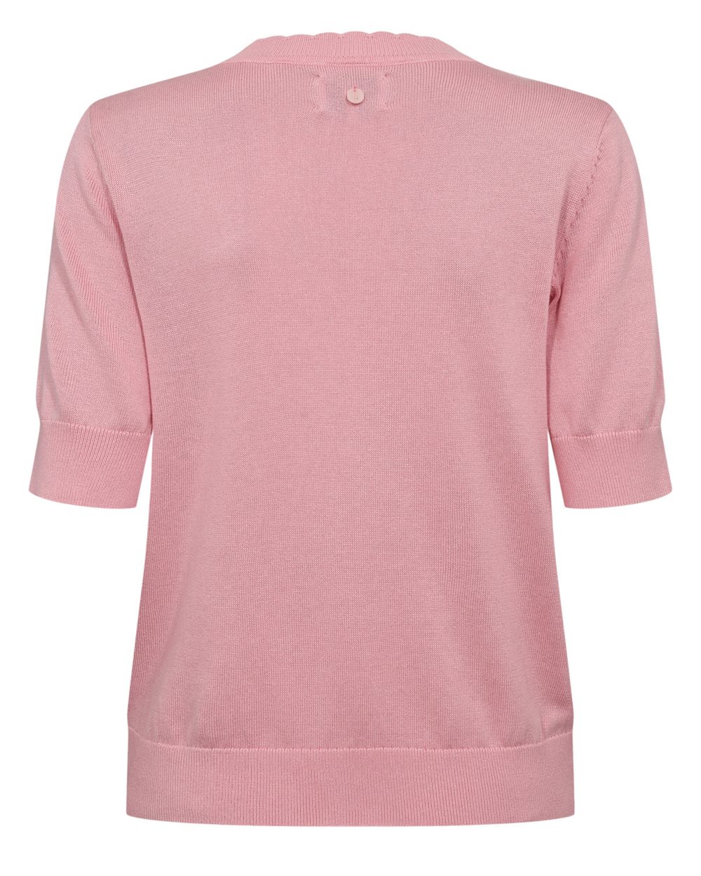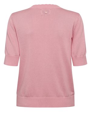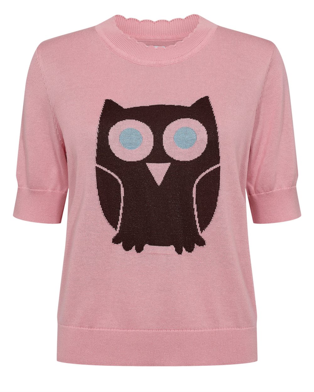 Pullover i en fin lyserød med et uglemotiv på maven og korte ærmer.