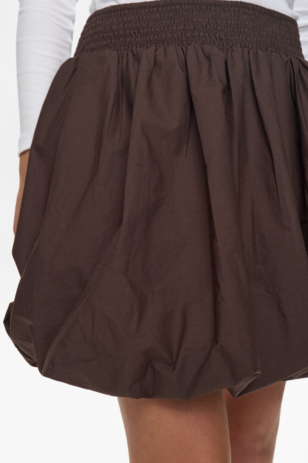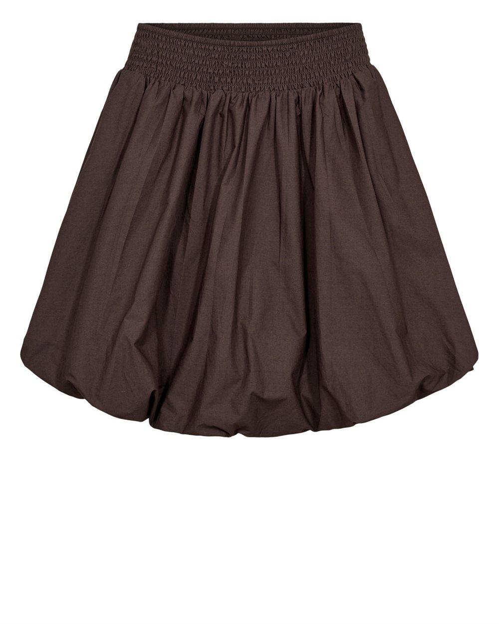 Kort ballon nederdel med elastik i livet. Nederdelen er alm i størrelse, i 100% bomuld og i en flot mørkebrun.