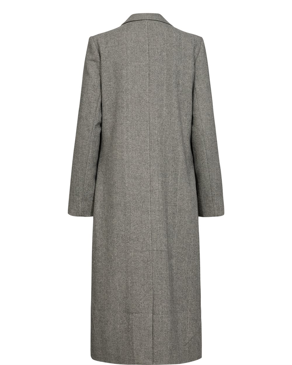 Lang frakke i en uldblanding i en flot grå melange. Frakken har knapper og krave i v-udskæring.