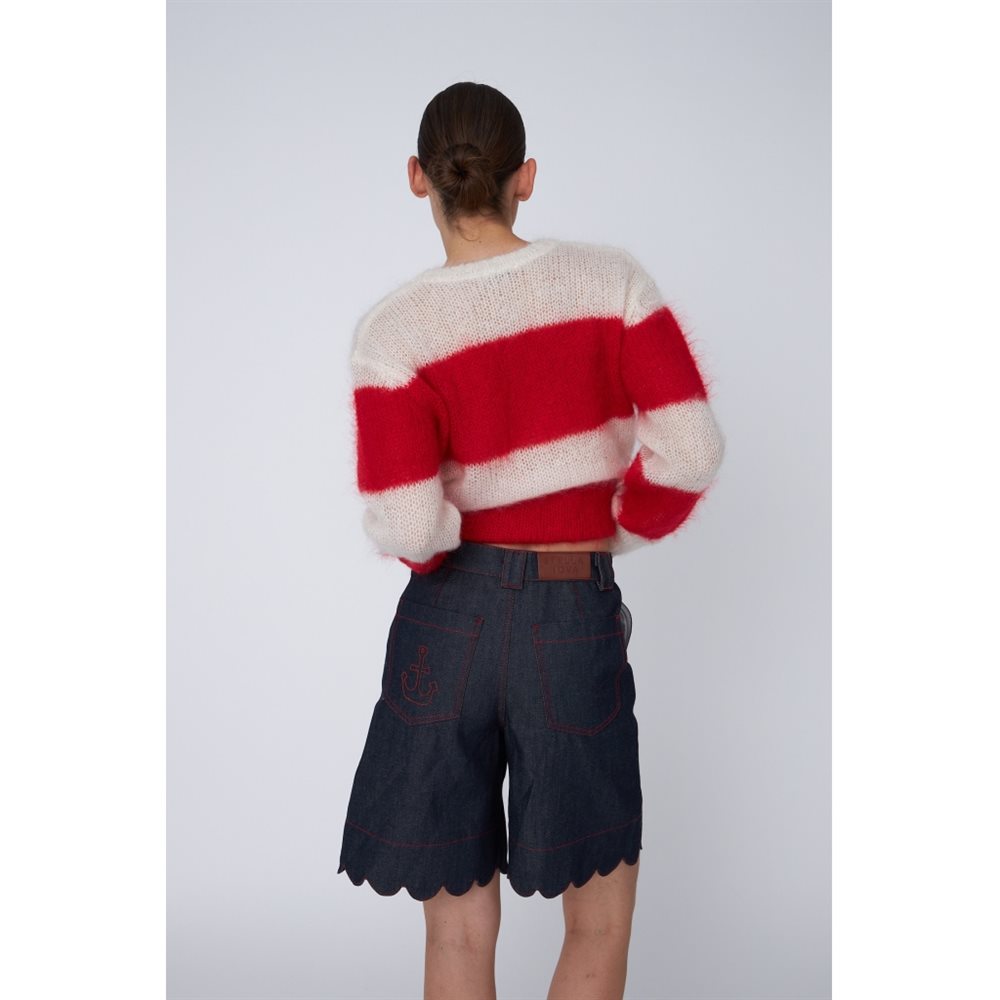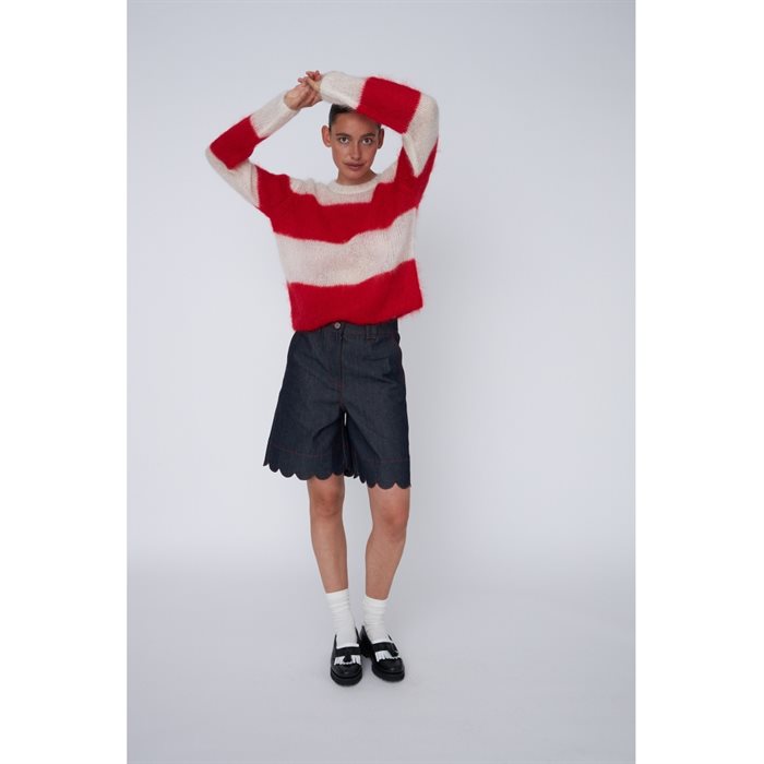 Mid-taljede denimshorts med bølgekanter, sidelommer og baglommer samt bæltestropper. De lukkes med en knap og lynlås.